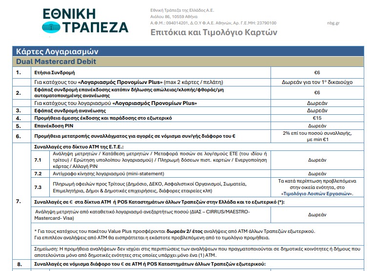 Η σχετική προμήθεια αναλύεται στο τιμολόγιο καρτών της Εθνικής Τράπεζας, το οποίο είναι διαθέσιμο για οποιονδήποτε χρήστη να το δει με τα δικά του μάτια εδώ.