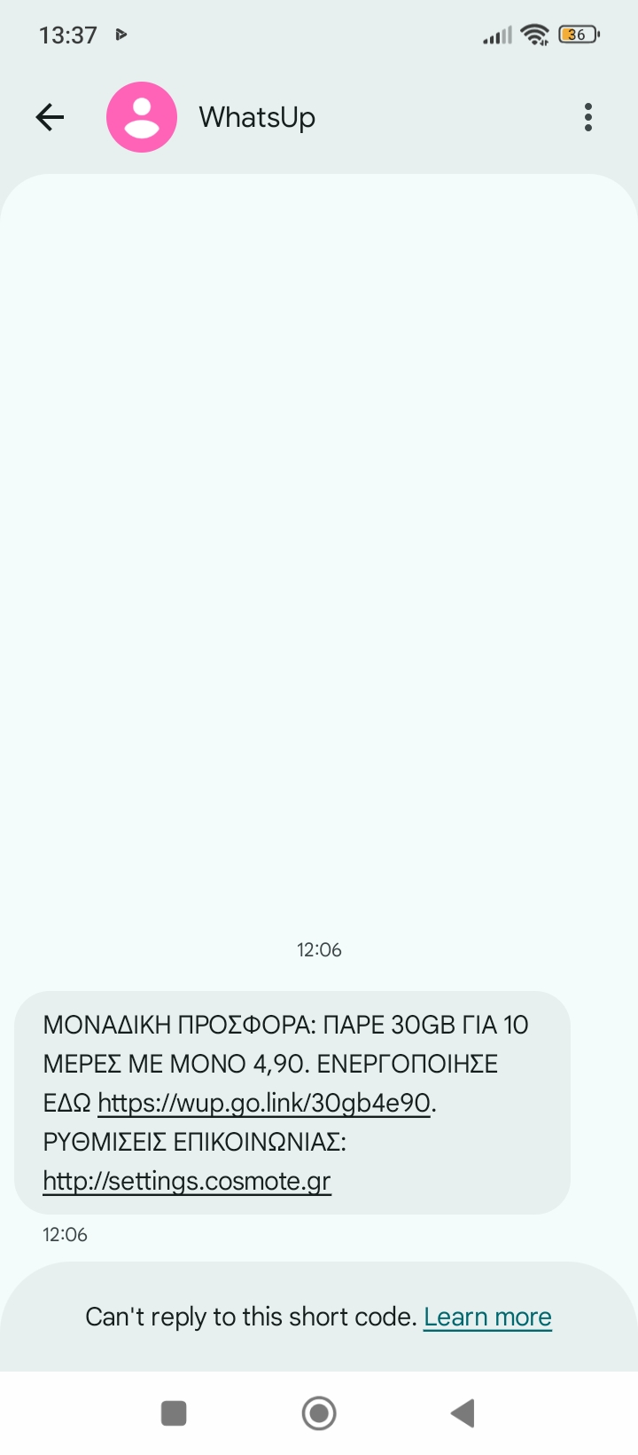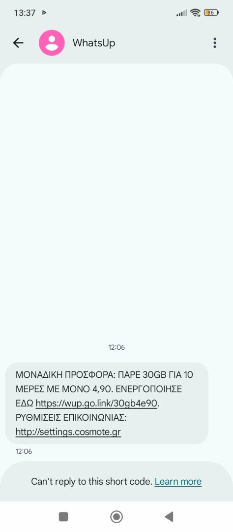 Πιο συγκεκριμένα, μήνυμα που μας στάλθηκε αναφέρει ότι μας δίνει 30GB με μόλις 4.95 ευρώ για 10 ημέρες. Δεν γνωρίζουμε αν τη δίνουν σε όλους, αξίζει να σημειωθεί ότι εν λόγω προσφορά μοιάζει πιο πολύ σαν προσπάθεια προώθησης του Balance Boost, δηλαδή της υπηρεσίας επέκτασης υπολοίπου του What’s UP. Υπηρεσία, η οποία επιτρέπει ανανέωση με 5 ευρώ, εφόσον έχεις ήδη πραγματοποιήσει ανανέωση μια φορά το μήνα 13 ευρώ και άνω. Τι νόμιζες θα σου επέτρεπαν ανανέωση με 5 ευρώ;
