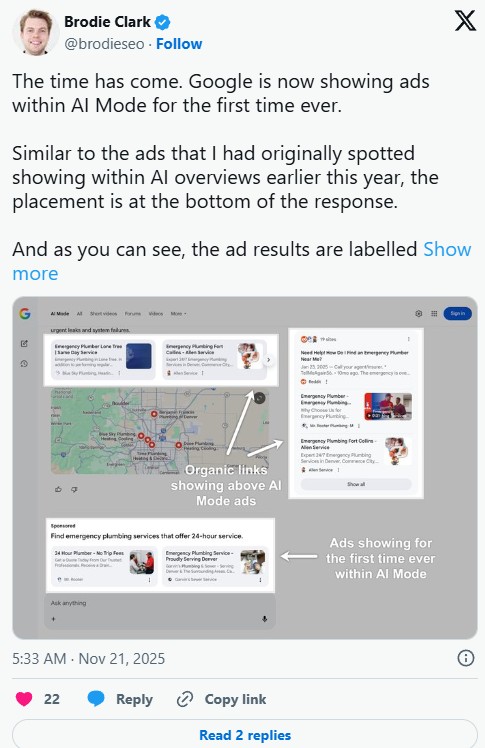 Η εταιρεία φαίνεται να δοκιμάζει την εισαγωγή διαφημίσεων και στο Google AI Mode, που μέχρι στιγμής, δεν είχε. Το AI mode αρχίζει να χρησιμοποιείται από όλο και περισσότερους χρήστες παγκοσμίως, και ως εκ τούτου είναι φυσικό η εταιρεία να θέλει να βγάλει χρήματα από αυτό.