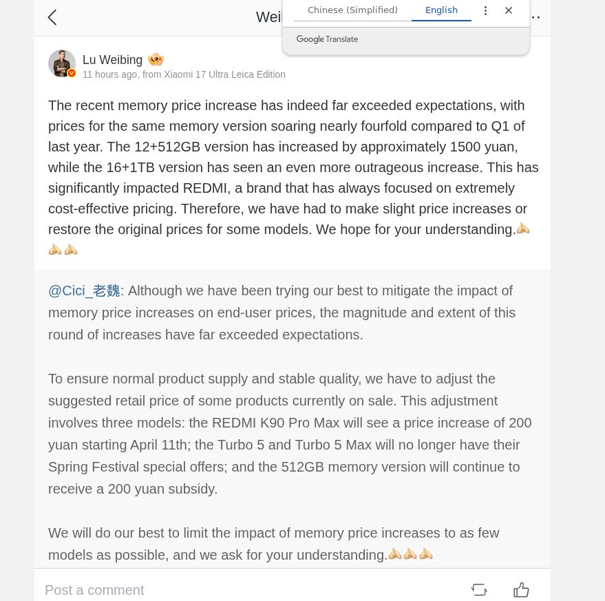 • Ο πρόεδρος της Xiaomi, Lu Weibing αναφέρει ότι το κόστος στην έκδοση 12/512GB έχει αυξηθεί κατά 218 δολάρια μέσα σε ένα χρόνο.