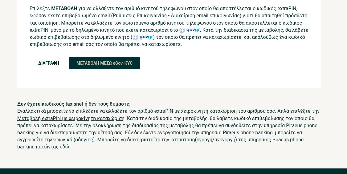 Επιλέξτε ΜΕΤΑΒΟΛΗ για να αλλάξετε τον αριθμό κινητού τηλεφώνου στον οποίο θα αποστέλλεται ο κωδικός extraPIN, εφόσον έχετε επιβεβαιωμένο email (Ρυθμίσεις Επικοινωνίας – Διαχείριση email επικοινωνίας) γιατί θα απαιτηθεί πρόσθετη ταυτοποίηση.