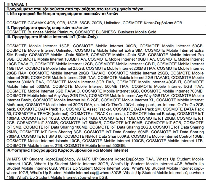 Εξαιρούνται από την ανωτέρω αύξηση τα προγράμματα που αναφέρονται στον Πίνακα 1.