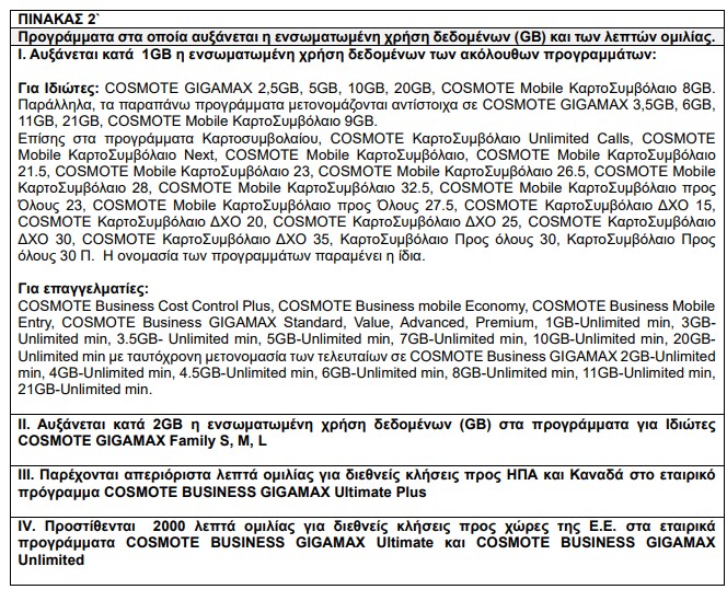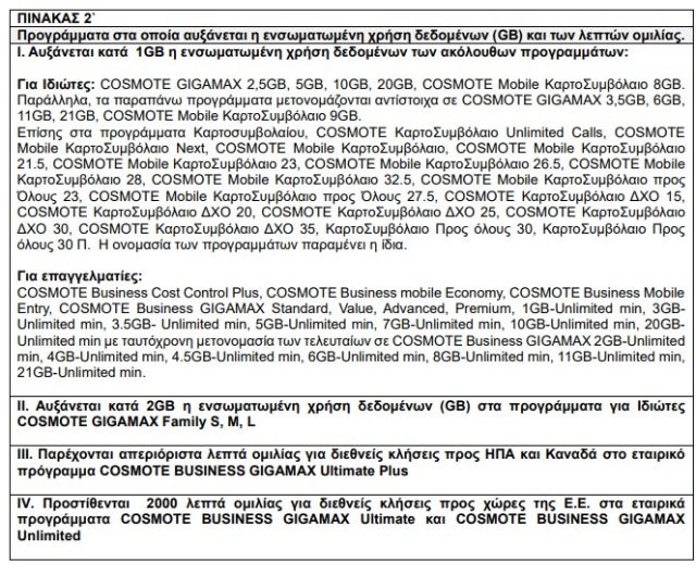 Μεγάλο μέρος των προγραμμάτων ενισχύεται με επιπλέον ενσωματωμένα GB, χωρίς καμία ενέργεια από πλευράς των συνδρομητών. Τα προγράμματα στα οποία αυξάνεται η ενσωματωμένη χρήση δεδομένων (GB) αναφέρονται αναλυτικά στον Πίνακα 2.