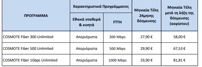 Η ΟΤΕ Α.Ε. ανακοινώνει τη διάθεση για περιορισμένο χρονικό διάστημα των προγραμμάτων COSMOTE Fiber 300Mbps, 500 Mbps & 1Gbps μέσω υποδομής οπτικής ίνας μέχρι το σπίτι (Fiber to the Home), 24μηνης δέσμευσης, σε τιμή προσφοράς, σύμφωνα με τον παρακάτω πίνακα: