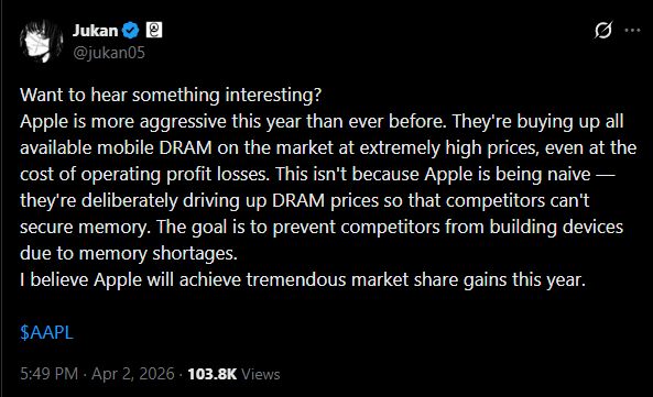 Ο Jukan της Citrini Research, υποστηρίζει πως η Apple αγοράζει σκόπιμα όση περισσότερη RAM μπορεί να βρει, ακόμα και σε εξωφρενικό κόστος, κάτι που ενδέχεται να προκαλέσει ζημιές βραχυπρόθεσμα. Αυτό όμως σημαίνει πως οι ανταγωνιστές της δε θα μπορούν να βρουν μνήμες RAM στην αγορά για τις δικές της συσκευές, κάτι που σημαίνει πως δε θα μπορούν να κατασκευάσουν τις δικές τους συσκευές, τουλάχιστον όχι στον όγκο που θέλουν.