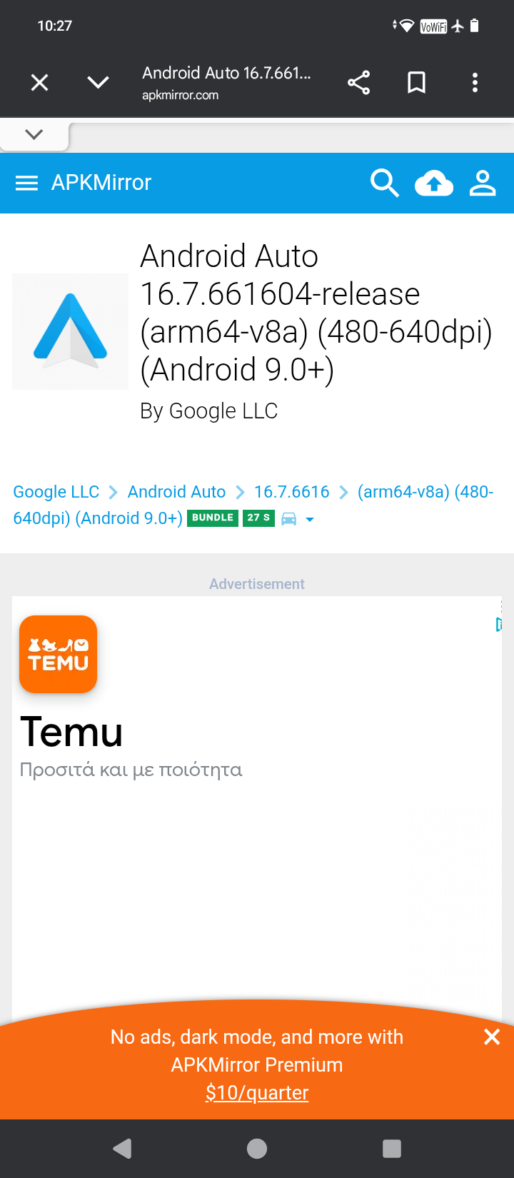 Αν δεν θέλεις να περιμένεις, υπάρχει ένας δεύτερος εύκολος τρόπος να προβείς σε χειροκίνητη εγκατάσταση. Πιο συγκεκριμένα κατεβάσαμε το Android Auto 16.7 APK αρχείο από το APK Mirror, που όπως έχει γράψει το techmaniacs.gr είναι το πιο έμπιστο κατάστημα εφαρμογών τρίτων εκτός Play Store.