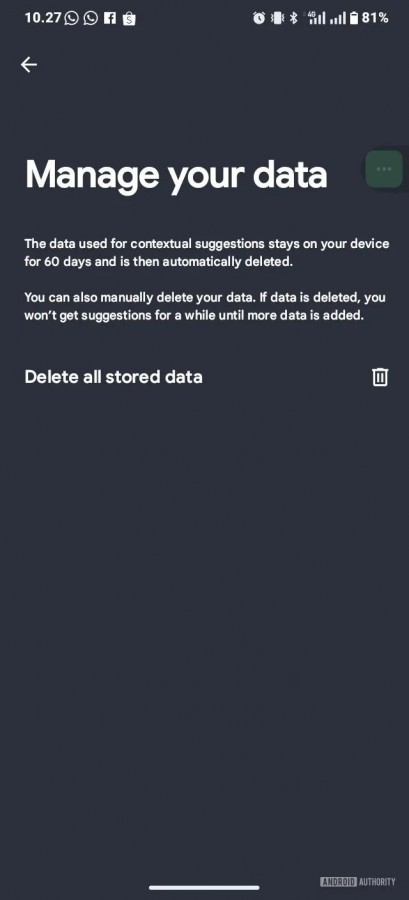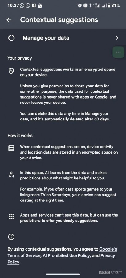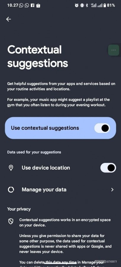 Τα δεδομένα που χρησιμοποιούνται προκειμένου να μπορέσει το Android να κάνει τις απαραίτητες προτάσεις δεν μοιράζονται ποτέ με άλλες εφαρμογές ή ακόμη και την ίδια τη Google. Παράλληλα, δεν φεύγουν ποτέ από τη συσκευή σου, ενώ μπορούν να διαγραφούν. Εκ προεπιλογής διαγράφονται μετά από 60 ημέρες.