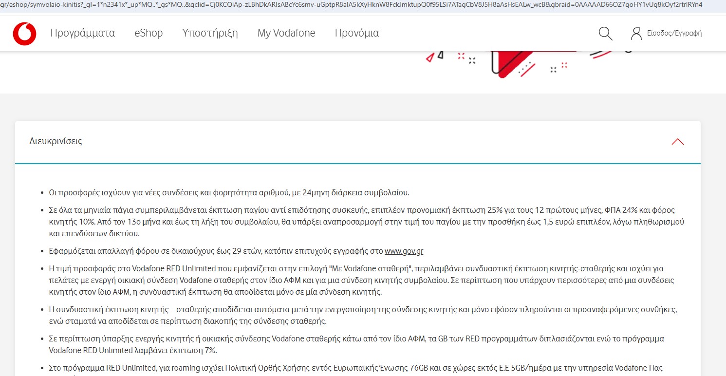 Αρχικά έχουμε την περίπτωση της Vodafone, η οποία, σύμφωνα με σχετική ενημέρωση που έχει κάτω από κάθε πρόγραμμα στην επίσημη ιστοσελίδα της, αναφέρει ότι από τον 13ο μήνα μέχρι και τη συμπλήρωση της ελάχιστης διάρκειας δέσμευσης, προβλέπεται η αύξηση της τιμής του παγίου σου κατά 1,5€ λόγω πληθωρισμού και επενδύσεων δικτύου.