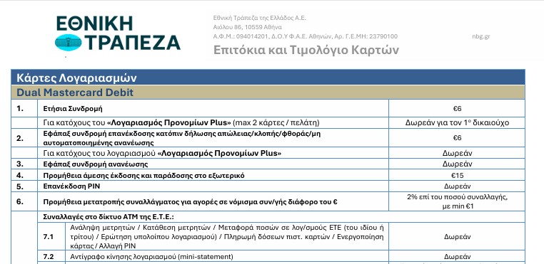 Αντιστοίχως, η Mastercard που έχουμε ήδη στη κατοχή μας έχει εφάπαξ συνδρομή ανανέωσης σύμφωνα με το τιμολόγιο καρτών 6 ευρώ. Όπως βλέπουμε, προσπαθούν συνεχώς να βρουν τρόπους να αυξήσουν τις προμήθειες απ’ το κάθε τι.