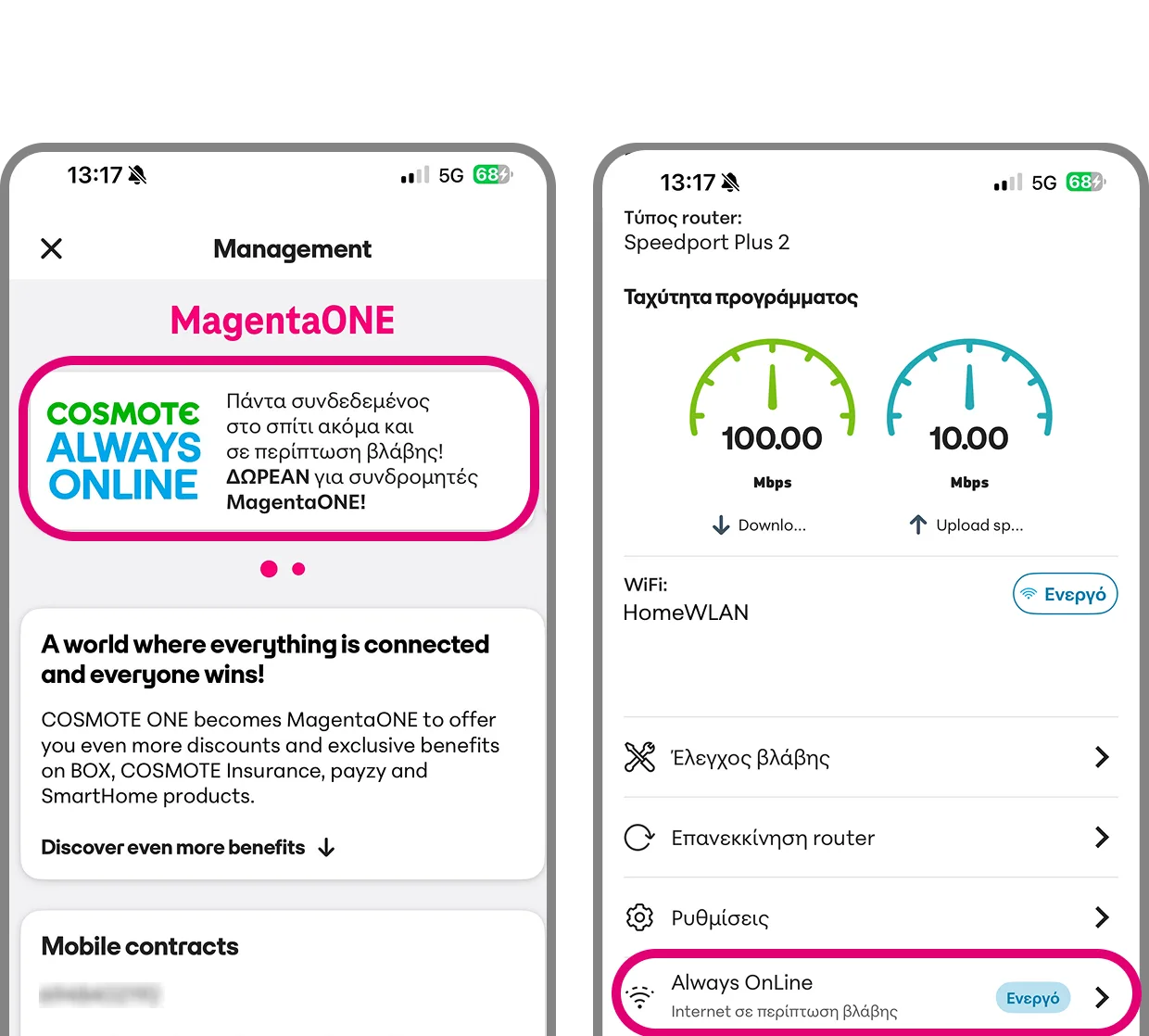 Η Cosmote προσπαθεί να προωθήσει την υπηρεσία Always Online, τη δωρεάν υπηρεσία η οποία είναι διαθέσιμη στα προγράμματα σταθερής. Η υπηρεσία μπορεί να ενεργοποιηθεί από όλους τους συνδρομητές που διαθέτουν σταθερή ευρυζωνική σύνδεση Cosmote και ένα ενεργό πρόγραμμα κινητής, συμβόλαιο ή καρτοσυμβόλαιο τη στιγμή όμως που είναι ενταγμένα σε MagentaOne.