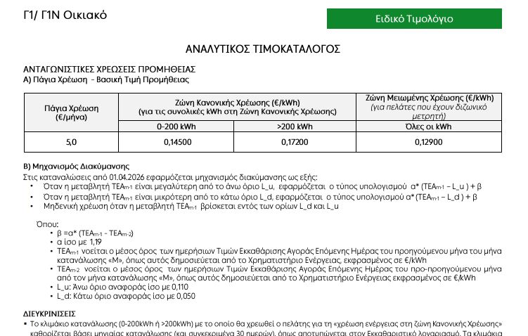 Όσον αφορά το νέο τιμοκατάλογο που θα ισχύει από 1/4/2024, αυτός διαμορφώνεται σε 0,14500 για 0 έως 200 kwh κατανάλωσης κάθε μήνα στη ζώνη κανονικής χρέωσης, ενώ άνω των 200 kw κατανάλωσης εφαρμόζεται δεύτερο κλιμάκιο όπου η χρέωση εκεί ανεβαίνει στα 0,17200 στη ζώνη κανονικής χρέωσης.
