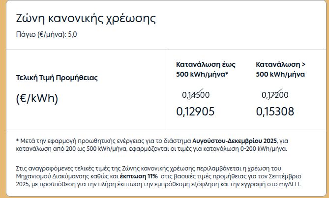 Μετά την εφαρμογή προωθητικής ενέργειας για το διάστημα Αυγούστου-Δεκεμβρίου 2025, για κατανάλωση από 200 ως 500 kWh/μήνα, εφαρμόζονται οι τιμές για κατανάλωση 0-200 kWh/μήνα. Παραθέτουμε και σχετική εικόνα από κάτω.