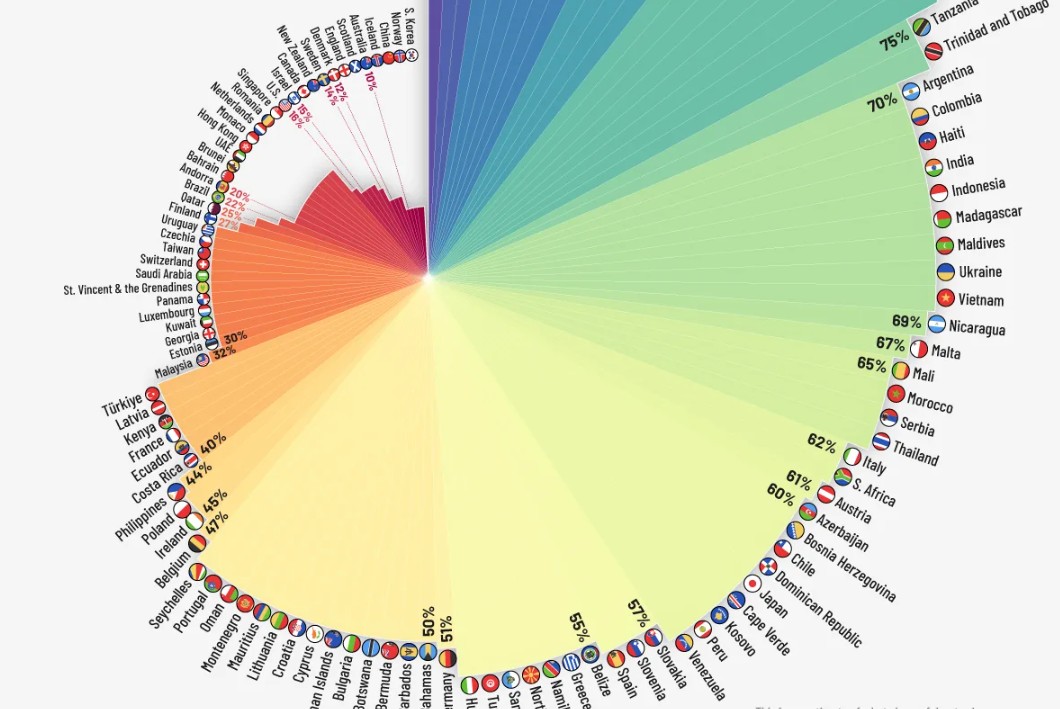 Σύμφωνα με δεδομένα που προέρχονται από το forex.de, και οπτικοποιήθηκαν από το Visual Capitalist, το 55% των καθημερινών συναλλαγών στη χώρα μας λαμβάνουν χώρα σε μετρητά. Η αναλυτική έρευνα η οποία είναι διαθέσιμη εδώ, παρουσιάζει ορισμένα άκρως ενδιαφέροντα στοιχεία: