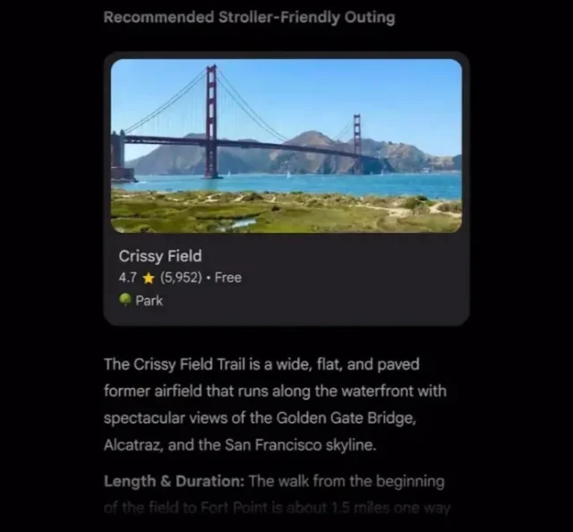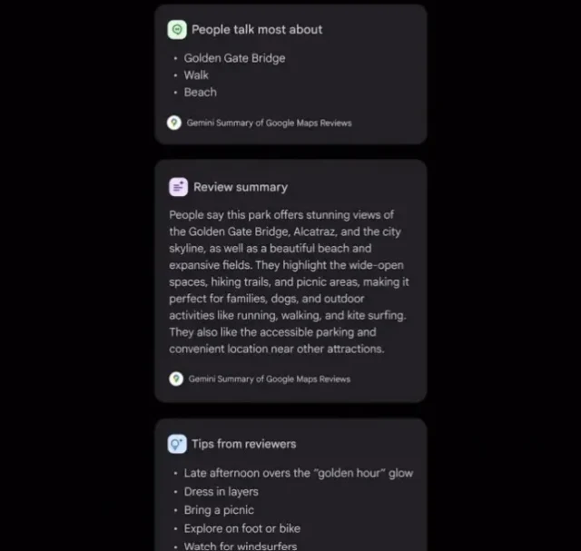 Δηλαδή, η παρουσίαση της πληροφορίας θα γίνει πλέον πολύ καλύτερη, ενώ οι τοποθεσίες που αναφέρει το Gemini θα εμφανίζονται με τη μορφή καρτών, μαζί με φωτογραφία και βαθμολογία, δεδομένα τα οποία θα αντλεί από τους Χάρτες Google.