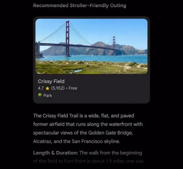 Δηλαδή, η παρουσίαση της πληροφορίας θα γίνει πλέον πολύ καλύτερη, ενώ οι τοποθεσίες που αναφέρει το Gemini θα εμφανίζονται με τη μορφή καρτών, μαζί με φωτογραφία και βαθμολογία, δεδομένα τα οποία θα αντλεί από τους Χάρτες Google.