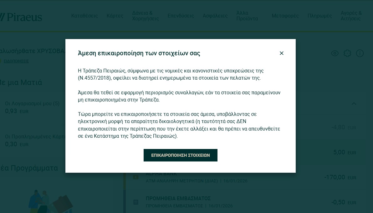 Η επικαιροποίηση στοιχείων στις τράπεζες είναι υποχρεωτική για όλους και απαραίτητη, καθώς χωρίς αυτή, θα υπάρξουν περιορισμοί στις συναλλαγές. Το μήνυμα που μας εμφανίζει η Πειραιώς: