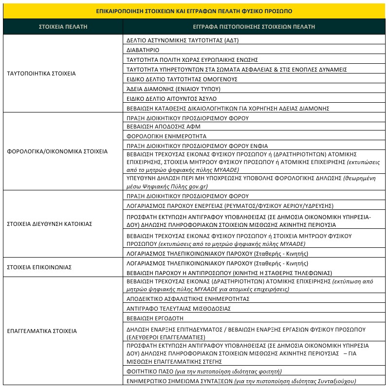 Αξίζει να σημειώσουμε ότι η Τράπεζα Πειραιώς έχει ανεβάσει στην επίσημη ιστοσελίδα της και τα έγγραφα που απαιτούνται για την επικαιροποίηση στοιχείων, προκειμένου ο πελάτης να μην ψάχνει την τελευταία στιγμή τι μπορεί να χρειάζεται. Η εικόνα που ακολουθεί παρακάτω περιλαμβάνει αναλυτικά την εν λόγω λίστα των εγγράφων, ανάλογα με την περίπτωση που θα συναντήσει ο πελάτης.