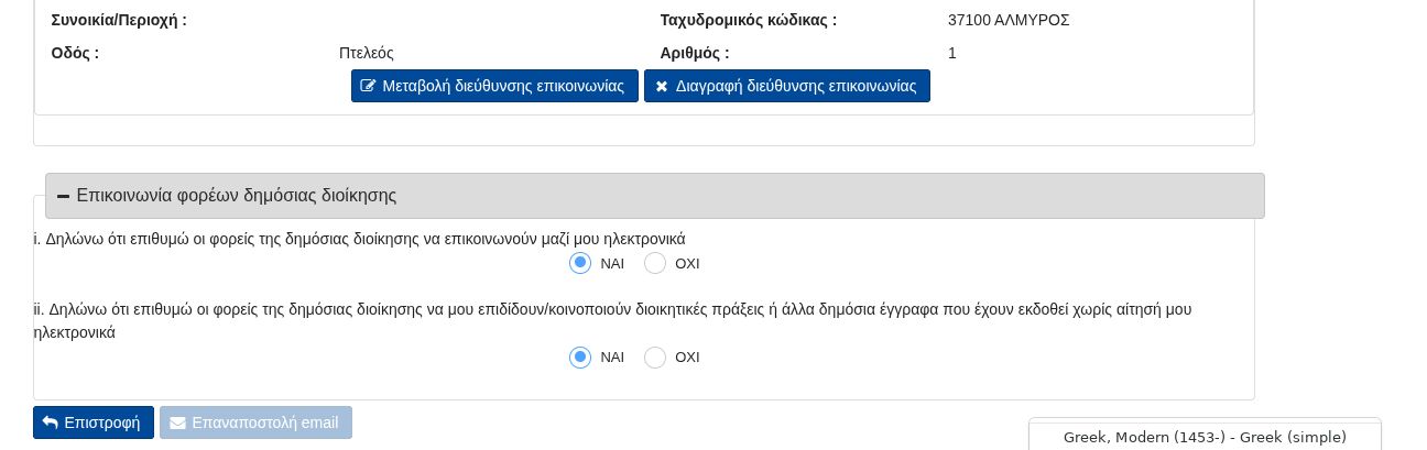 - δηλώνω ότι επιθυμώ οι φορείς της δημόσιας διοίκησης να επικοινωνούν μαζί μου ηλεκτρονικά, να κάνεις μπλε το ναι.