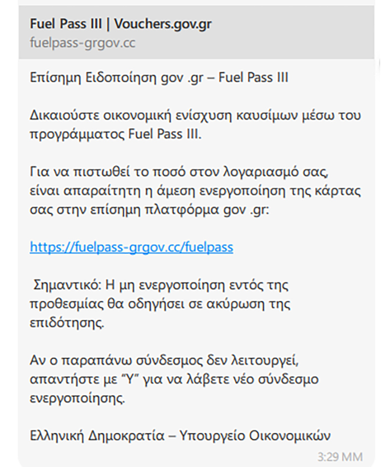 Εύκολα μπορείς να καταλάβεις ότι πρόκειται για απάτη από τον σύνδεσμο που υπάρχει μέσα σε αυτό. Θα πρέπει να σημειώσουμε στους αναγνώστες μας ότι δεν χρειάζεται να ενεργοποιηθεί κάρτα στην επίσημη πλατφόρμα του gov.gr.