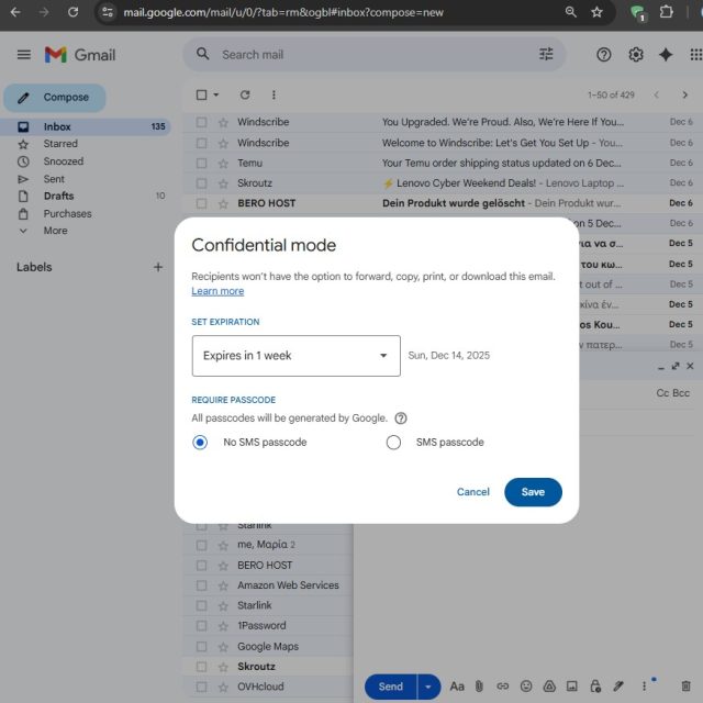Ο λόγος για το Confidential mode το οποίο είναι διαθέσιμο στην Ελλάδα και για απλούς οικιακούς λογαριασμούς Gmail, δηλαδή καθημερινούς Gmail λογαριασμούς που χρησιμοποιούμε όλοι μας.