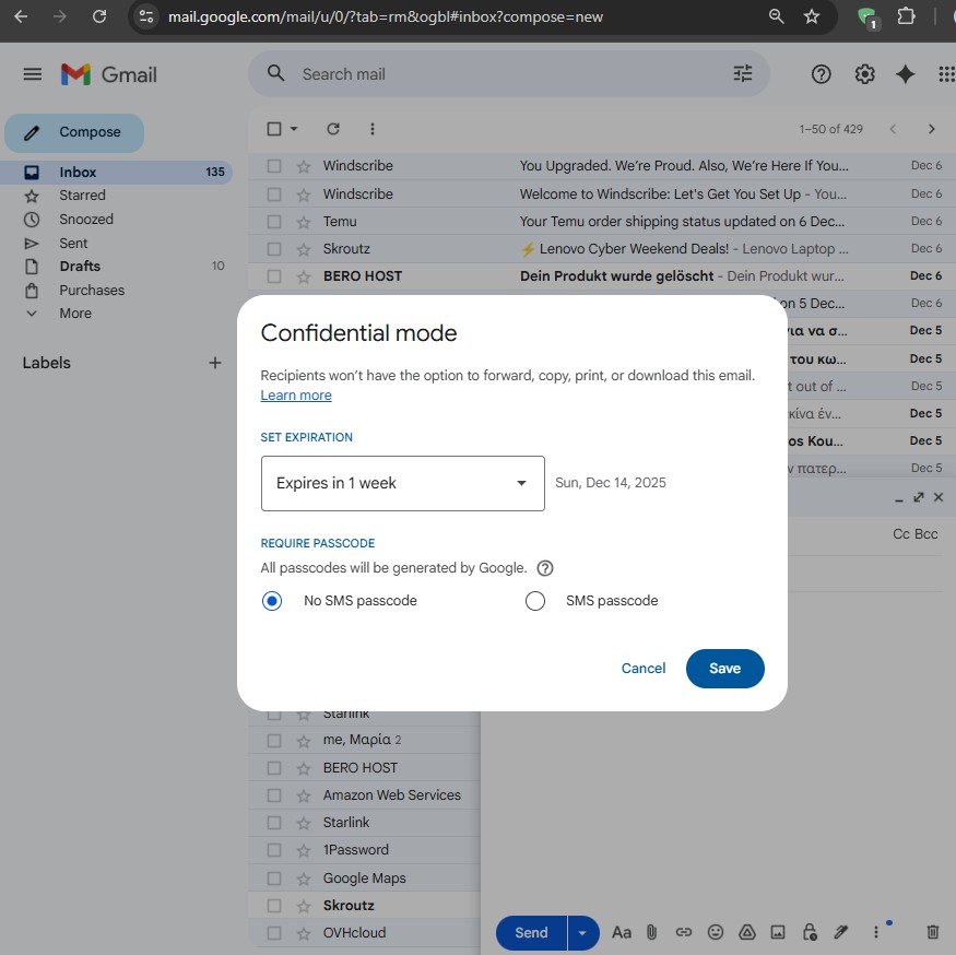 Το Confidential Mode είναι ένα ειδικό mode που υπάρχει διαθέσιμο για όλους τους χρήστες και σου επιτρέπει να στέλνεις μηνύματα και συνημμένα αρχεία με έναν τρόπο πιο ασφαλή από τα απλά emails. Μπορείς, δηλαδή, να ρυθμίσεις το confidential mode, ώστε το μήνυμά σου να έχει ημερομηνία λήξης ή να κάνεις revoke την πρόσβαση από πλευράς παραλήπτη οποιαδήποτε στιγμή.