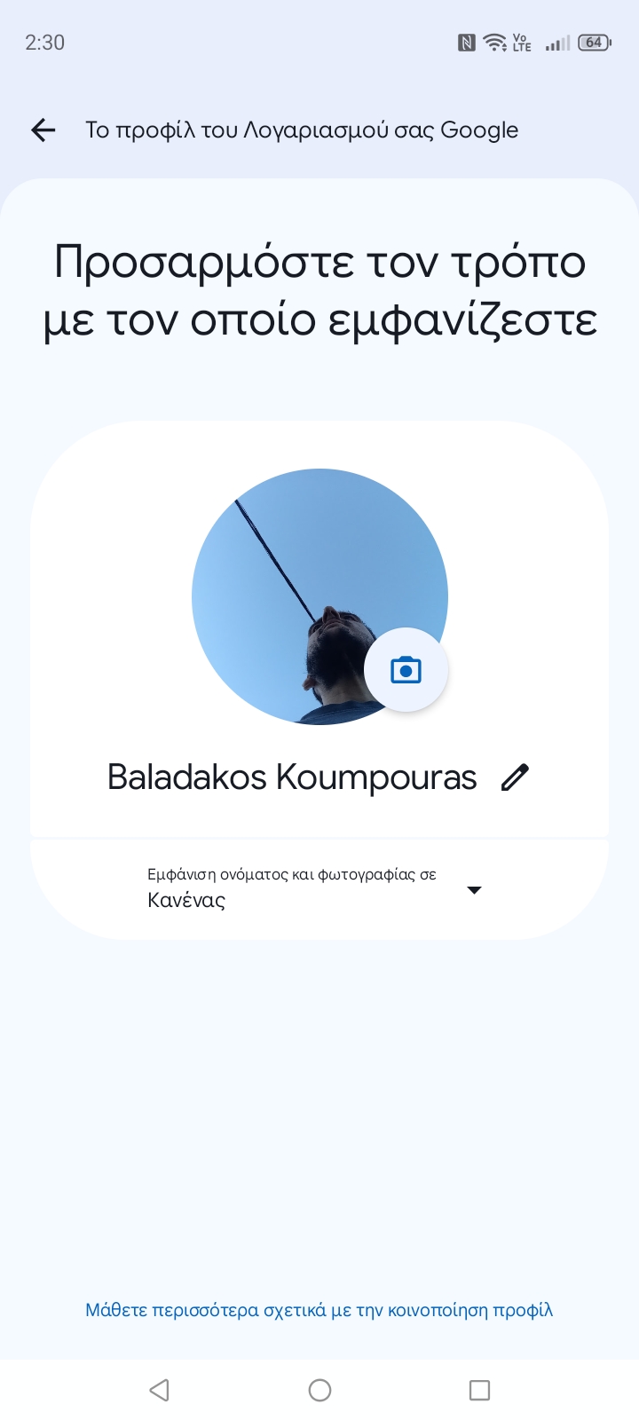 • Ή μπορείς, όπως δείχνει το screenshot που έχουμε παρακάτω, να επιλέξεις να προσαρμόσεις τον τρόπο με τον οποίο εμφανίζεσαι κάνοντας δηλαδή την εξής επιλογή: Εμφάνιση ονόματος και φωτογραφίας σε κανένας.
