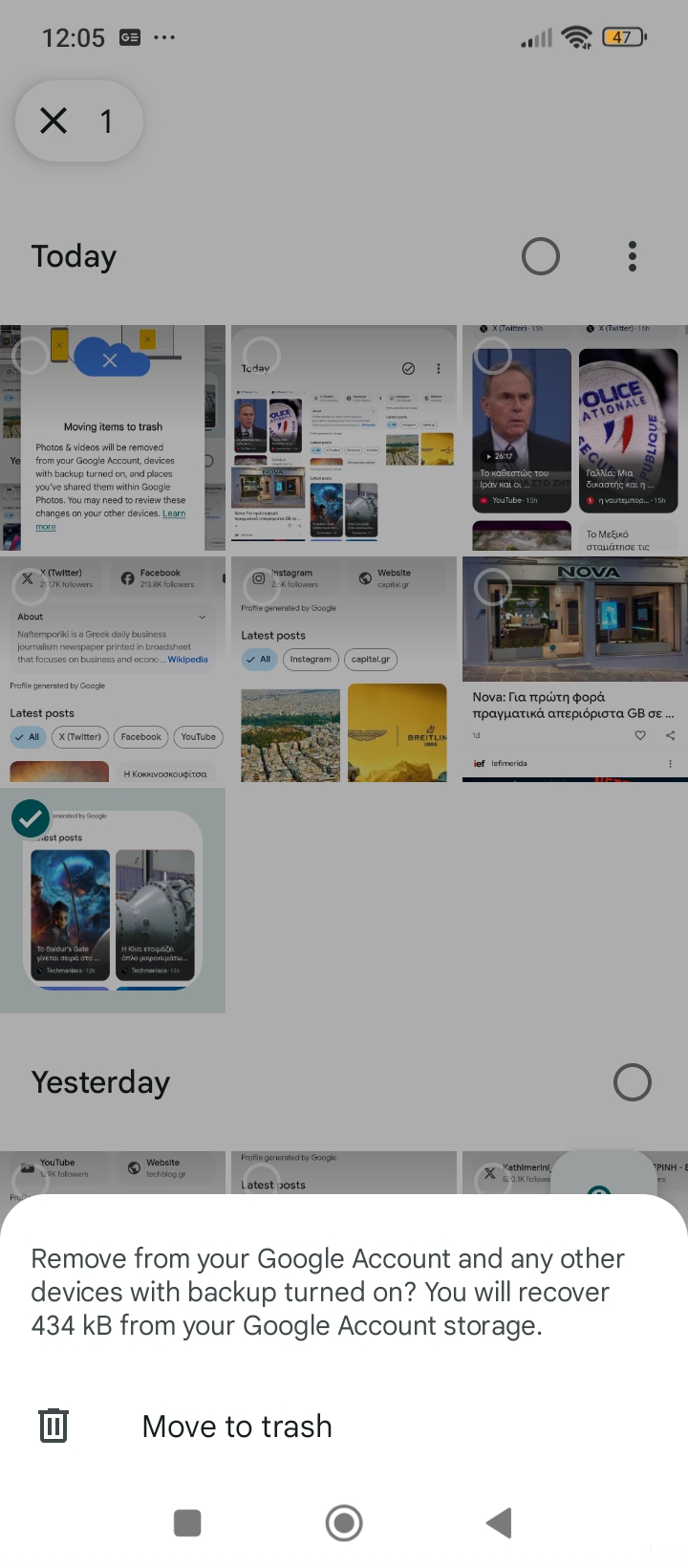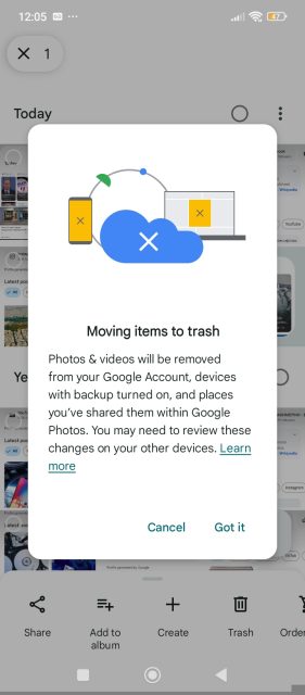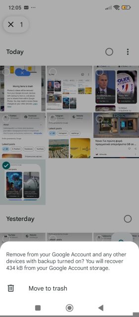Σημαίνει ότι το Google Photos προσπαθεί να παίξει έξυπνα με τη συσκευή σου και να σε γλιτώσει από χρόνο και χώρο αποθήκευσης. Όταν εσύ δίνεις εντολή να διαγράψει ένα αντίγραφο φωτογραφιών, ή μια φωτογραφία, τότε αυτό πηγαίνει και διαγράφει όλα τα αντίγραφα που υπάρχουν στη συσκευή. Βέβαια, αξίζει να γίνει σημαντική υπενθύμιση εδώ, όπως δείχνω και στα screenshots που ακολουθούν, ότι η Google σε προειδοποιεί ότι θα διαγραφούν οι φωτογραφίες και από τον Google λογαριασμό, αλλά και από όλες τις συσκευές που έχει ενεργοποιηθεί το backup.
