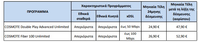 Η ΟΤΕ Α.Ε. ανακοινώνει τη διάθεση για περιορισμένο χρονικό διάστημα των προγραμμάτων 24μηνης δέσμευσης, σε τιμή προσφοράς, σύμφωνα με τον παρακάτω πίνακα: