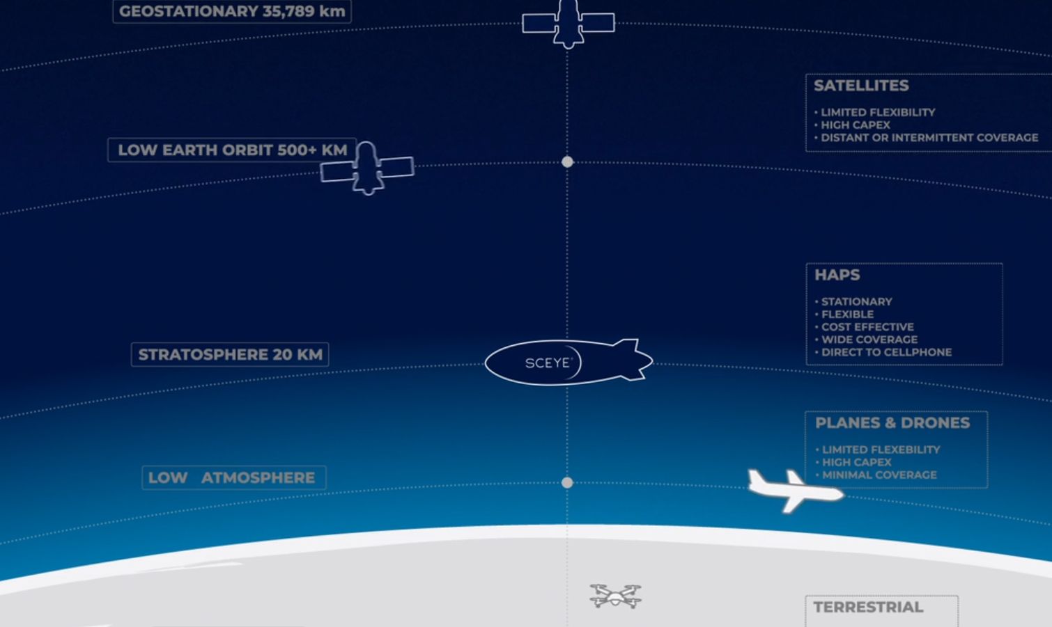 Στόχος του συστήματος HAPS της Sceye είναι να ανταγωνιστεί με δορυφόρους ως ένα νέο επίπεδο υποδομής στη στρατόσφαιρα, παρέχοντας