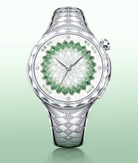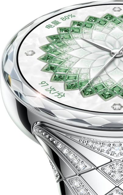 Όμως η Huawei ήθελε κάτι πραγματικά premium και περισσότερο κόσμημα από κάθε άλλο smartwatch. Έτσι, στην κορόνα θα βρούμε ένα διαμάντι με 18 έδρες, όμως και πάλι δεν ήταν αρκετό. Το λουράκι και μέρος του πλαισίου, είναι κολλημένα από ένα μοτίβο, που περιλαμβάνει 98 φυσικά διαμάντια. Εδώ να πούμε πως πλαίσιο και λουράκι, είναι κατασκευασμένα από κράμα τιτανίου.