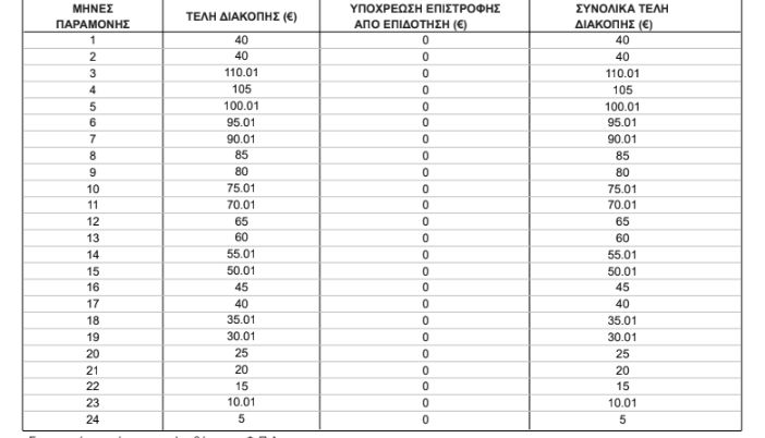 - Εάν η διακοπή γίνει εντός των δύο πρώτων μηνών του συμβολαίου, ο συνδρομητής καταβάλει τα πάγια δύο (2) μηνών, πέραν των παγίων που αντιστοιχούν στο χρόνο παραμονής. Στο ποσό αυτό προστίθεται το εναπομείναν ποσό απόσβεσης για τυχόν επιδότηση συσκευής ή/και τερματικού εξοπλισμού ή/και κατασκευής σύνδεσης στο δίκτυο που αντιστοιχεί στο διάστημα για το οποίο δεν καταβάλλονται πάγια, δηλαδή για τους εναπομείναντες μήνες, μετά τη χρονική στιγμή επέλευσης των αποτελεσμάτων της ως άνω καταγγελίας, μέχρι την κανονική λήξη της σύμβασης μείον δύο μήνες.