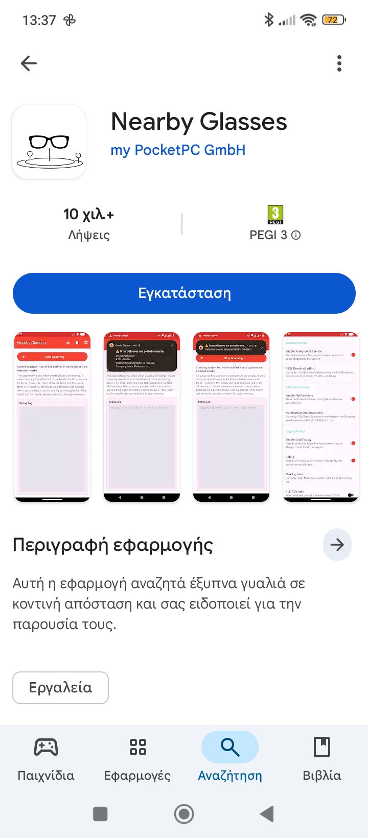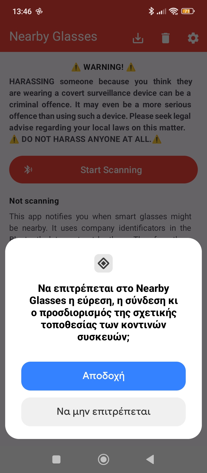 Σε κάθε περίπτωση, η εφαρμογή ειδοποιεί και εντοπίζει αν υπάρχουν κοντινές συσκευές Smart Glasses. Μόλις ανοίξαμε την εφαρμογή, μας ζήτησε να δώσουμε άδεια, να επιτρέπεται στο Nearby Glasses η εύρεση, σύνδεση και ο προσδιορισμός της σχετικής τοποθεσίας των κοντινών συσκευών, όπως δείχνει και το screenshot που έχουμε. Στη συνέχεια, μας ζητάει αν θα πρέπει να επιτρέψουμε στο Nearby Glasses να μας στέλνει ειδοποιήσεις. Πατάμε και εδώ αποδοχή. Και αμέσως ξεκινάει το σκανάρισμα. Αξίζει να σημειωθεί ότι υπάρχει ο κίνδυνος να υπάρχουν και false positives, όπως αναφέρει το ίδιο το app.