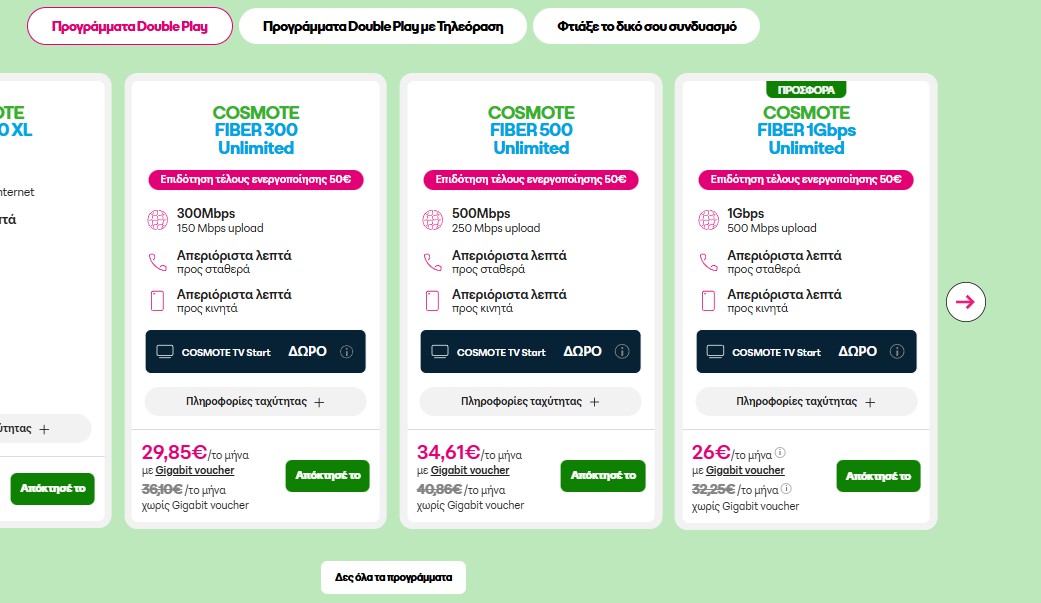 Στο site της Cosmote αυτή τη στιγμή αποτυπώνονται ξεκάθαρα και οι τιμές που ίσχυαν με το Voucher, δηλαδή με 29.85 ευρώ δίνει τα 300Mbps με το Gigabit Voucher, τα 500Mbps κόστιζαν 34.61 (40 ευρώ χωρίς Gigabit), ενω το 1Gbps στα 26 στα πλαίσια προσφοράς για τους 12 πρώτους μήνες και στη συνέχεια στα 33.90 ευρώ, όπως γράφει και η ανακοίνωση.
