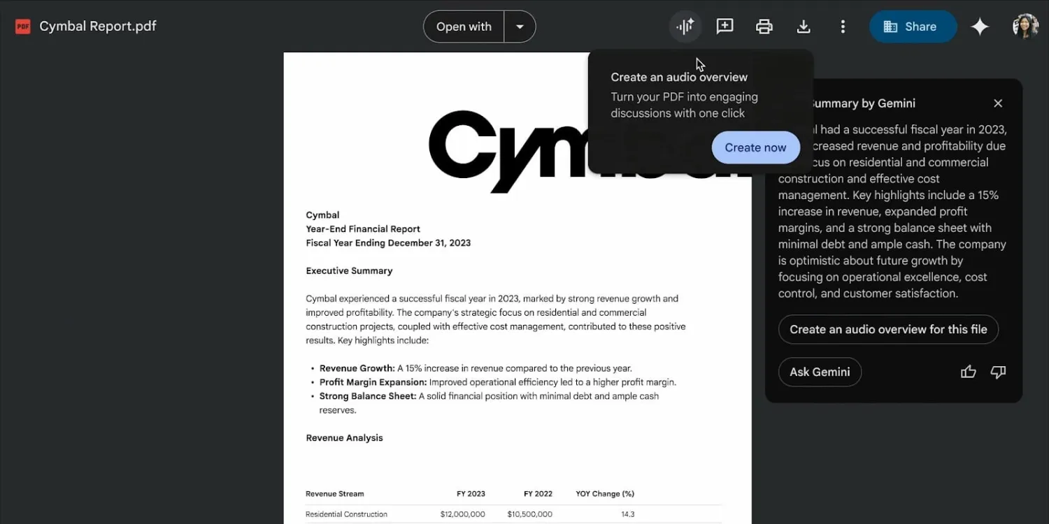 Όταν ανοίγεις ένα PDF στο Drive μέσω υπολογιστή, εμφανίζεται ένα νέο κουμπί με την ένδειξη “Audio Overview” στη γραμμή εργαλείων. Πατώντας το, ενεργοποιείται η Gemini – η τεχνητή νοημοσύνη της Google – η οποία δημιουργεί μια σύντομη ηχητική σύνοψη του περιεχομένου. Η διαδικασία διαρκεί λίγα λεπτά και το αποτέλεσμα είναι ένα αρχείο ήχου διάρκειας 2 έως 10 λεπτών.