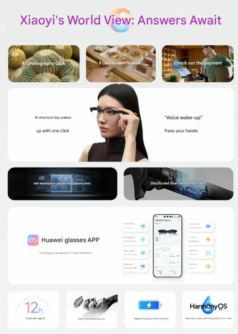 Στο εσωτερικό θα βρούμε ένα chip τεχνητής νοημοσύνης, το οποίο έχει αναπτυχθεί από την ίδια την Huawei. Η εταιρεία ισχυρίζεται πως το chip της προσφέρει άμεσους χρόνους απόκρισης στις φωνητικές εντολές, ενώ υποστηρίζει και φωνητικό ξύπνημα της συσκευής, όπως όλα τα γυαλιά με τεχνητή νοημοσύνη. Φυσικά τα γυαλιά έχουν κάμερες, για να μπορούν να δουν τον κόσμο γύρω μας και να απαντήσουν ερωτήσεις γύρω από όσα βλέπουμε. Ταυτόχρονα, μπορούν να κάνουν πληρωμές στην Κίνα, απλά κοιτώντας τα QR Codes του Alipay, έναν πολύ διαδεδομένο τρόπο πληρωμής στην Ασία.