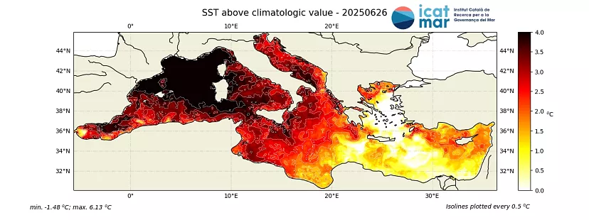 Ειδικότερα, στις 29 Ιουνίου του 2025, οι επιφανειακές θερμοκρασίες έφτασαν τους 26 βαθμούς Κελσίου, σύμφωνα με δεδομένα που συλλέχθηκαν από τον Κοπέρνικο και αναλύθηκαν από το Météo France.