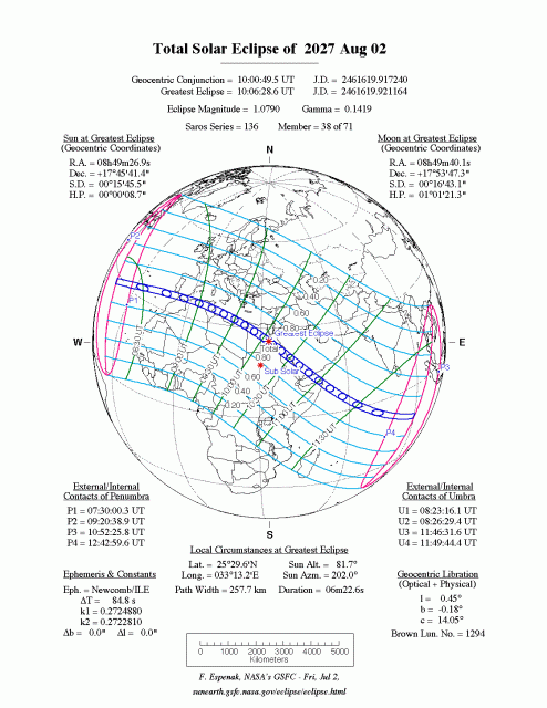 Σύμφωνα με το επίσημο καλεντάρι της NASA, η μεγαλύτερη ολική ηλιακή έκλειψη των τελευταίων 100 ετών θα λάβει χώρα στις 2 Αυγούστου του 2027. Θα έχει διάρκεια 6 λεπτών και 23 δευτερολέπτων και κατά το χρονικό διάστημα αυτό περιοχές της Ευρώπης, της Αφρικής και της Μέσης Ανατολής θα βρίσκονται κυριολεκτικά κάτω από την σκιά της Σελήνης.