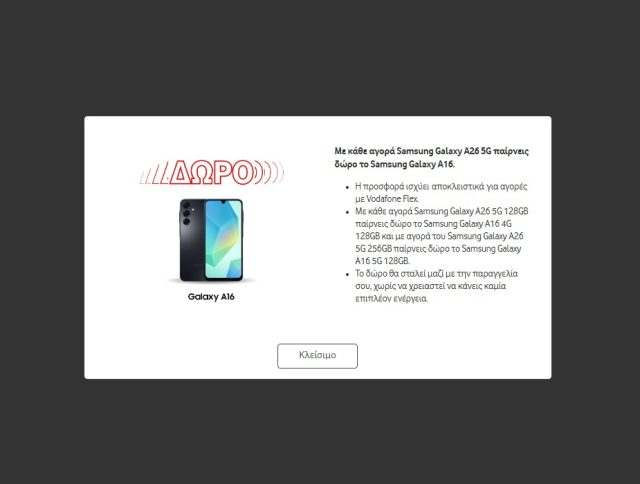 Όποιος επιλέξει να αγοράσει το Samsung Galaxy A26 και να το βάλει σε δόσεις μέσω του λογαριασμού Vodafone, με τον τρόπο που περιγράψαμε παραπάνω, θα έχει την ευκαιρία η Vodafone να του στείλει μια εντελώς δωρεάν νέα συσκευή, και πιο συγκεκριμένα, το Samsung Galaxy A16.