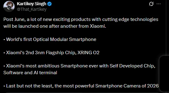 Σε μια νέα διαρροή από τον Kartikey Singh μιλάει για μια επερχόμενη συσκευή της Xiaomi, που θα έρθει το δεύτερο εξάμηνο του 2026 και θα έχει chipset σχεδιασμένο από την ίδια την εταιρεία. Θα έρθει με πάρα πολλές αναβαθμίσεις, τόσο στο chipset όσο και στην κάμερα, με έναν νέο αρθρωτό σχεδιασμό.