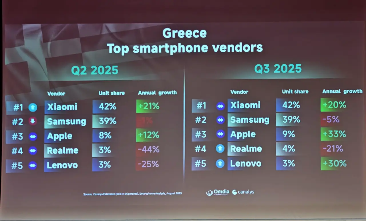 Στη δεύτερη θέση είναι η Samsung, με μερίδιο αγοράς 39% στο δεύτερο και τρίτο τρίμηνο του 2025, που είναι 1% και 5% πτώση σε σχέση με το δεύτερο και τρίτο τρίμηνο του 2024. Η Samsung φαίνεται πως είναι σε πτώση το 2025 στην χώρα μας, σημειώνοντας πιο χαμηλή ζήτηση από ότι συνήθως.
