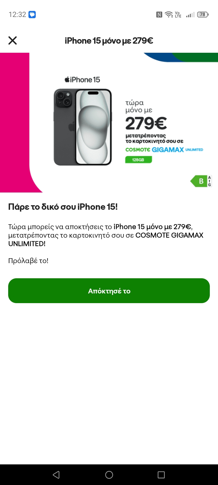 Αν κάποιος ανοίξει την εφαρμογή του My Cosmote στο κινητό του, θα διαπιστώσει ότι εντός της εφαρμογής η Cosmote έχει μια προσφορά η οποία δίνει το iPhone 15 με 279€, αρκεί να κάνεις μετατροπή σε Cosmote GigaMax Unlimited.