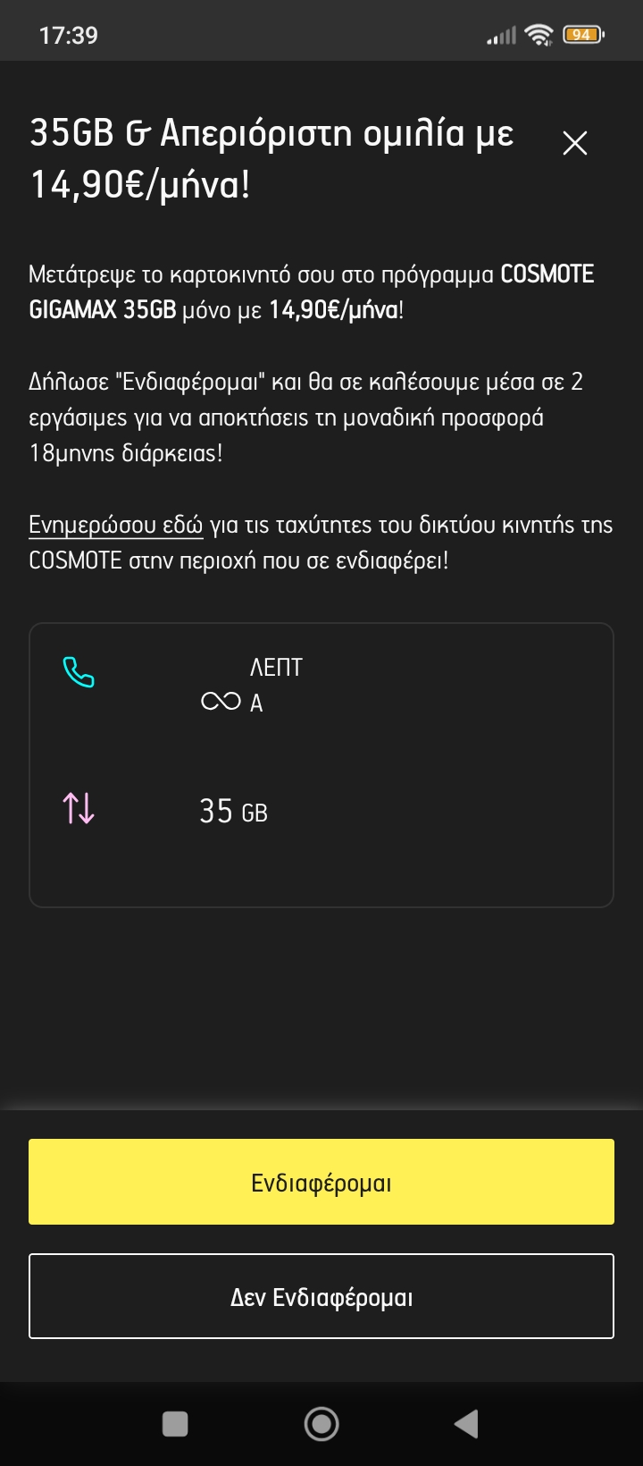 Ωστόσο, εντός της εφαρμογής του What’s UP, εντοπίσαμε πριν από λίγες ώρες μια νέα προσφορά, η οποία σου δίνει συμβόλαιο με 14.90 ευρώ κάθε μήνα. Αξίζει να σημειώσω ότι την εν λόγω προσφορά την είχε κάνει ξανά διαθέσιμη και πριν από μερικούς μήνες.