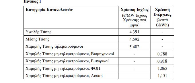Την έγκριση τιμολογίων για τη χρέωση της χρήσης του ΕΣΜΗΕ (Μοναδιαίες Χρεώσεις Χρήσης Συστήματος) σε Καταναλωτές Υψηλής Τάσης και σε Καταναλωτές Μέσης και Χαμηλής Τάσης των Διασυνδεδεμένων με το ΕΣΜΗΕ Δικτύων Διανομής, σύμφωνα με τον Πίνακα 1