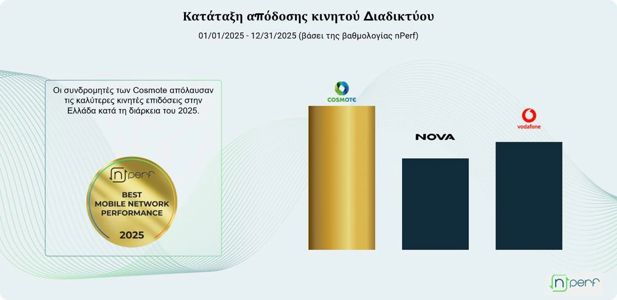 Δελτίο Τύπου: Η Cosmote επιβάλλεται ως ηγέτης του Internet κινητής στην Ελλάδα για το έτος 2025, σύμφωνα με το ετήσιο barometer nPerf. Αυτή η έκδοση αποκαλύπτει ισχυρή απόδοση στο 5G και ένα δυναμικό τοπίο με αντιθετικές τάσεις μεταξύ των παρόχων.