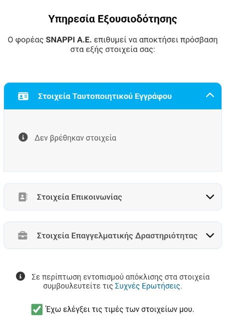Το πρόβλημα όμως είναι ότι είχαμε αλλάξει ταυτότητα με την καινούργια χωρίς προσωπικό αριθμό ήδη από το 2024. Όταν προσπαθούσαμε επιβεβαιώσουμε τα στοιχεία μας μέσω gov και να δώσουμε τη συναναίνεσή μας για να πάνε στη Snappi κατά την εγγραφή, ο αριθμός της νέας ταυτότητας δεν εμφανιζόταν, παρά το γεγονός ότι στο Εθνικό Μητρώο Επικοινωνίας εμφανίζεται ο νέος αριθμός.