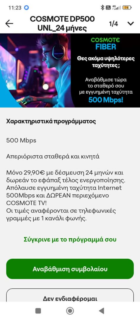 Πώς μπορείς να πείσεις κάποιον που είναι ήδη συνδρομητής Cosmote σταθερής τηλεφωνίας ADSL έως 24 Mbps και βρίσκεται σε μία περιοχή η οποία έχει διαθεσιμότητα οπτικής ίνας να αναβαθμίσει σε αυτήν; Μα με μία προσφορά στα 500 Mbps με 29.90 το μήνα.