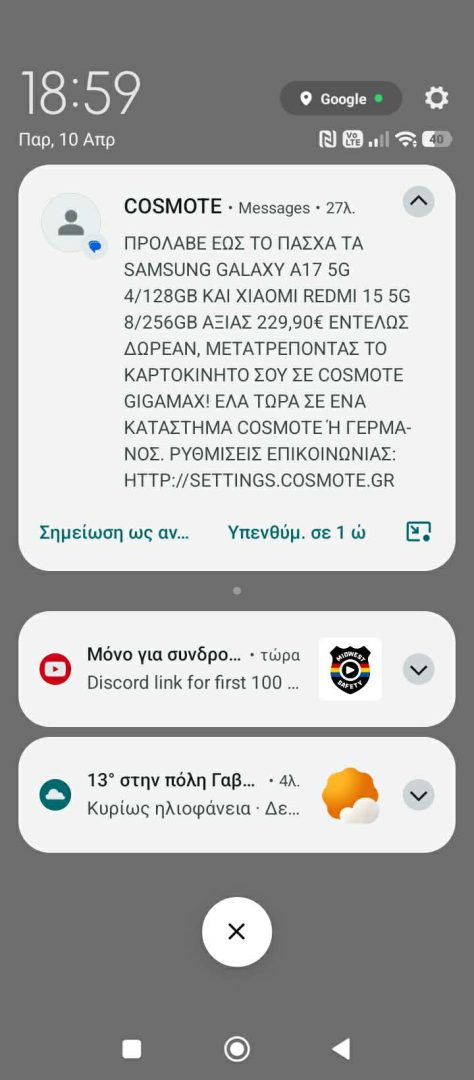 Σε ενημερωτικό μήνυμα που στέλθηκε πριν από λίγη ώρα στο κινητό μας, screenshot του οποίου συμπεριλαμβάνουμε στο τέλος του άρθρου, η Cosmote σου δίνει τη δυνατότητα να πάρεις εντελώς δωρεάν το Samsung Galay A17 5G.