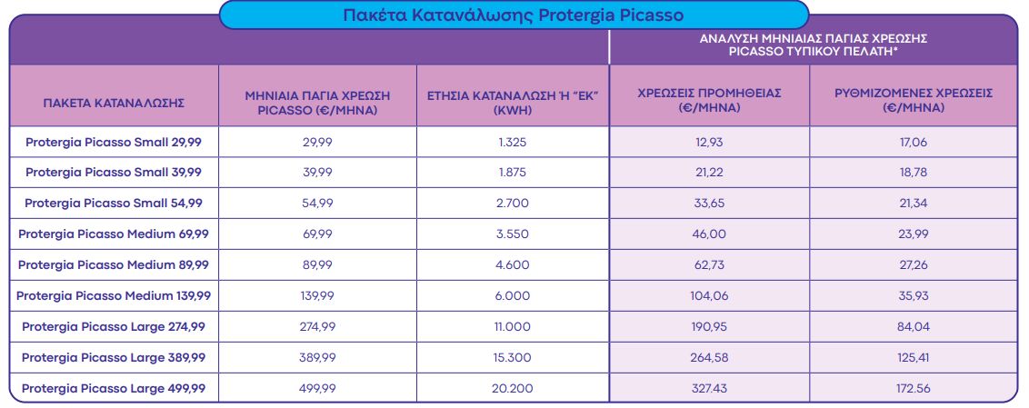 - Το κόστος του πακέτου Picasso περιλαμβάνει τις Χρεώσεις Προμήθειας και τις Ρυθμιζόμενες Χρεώσεις.