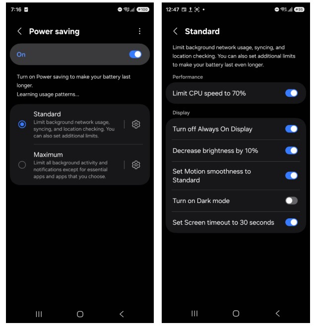 Καλύτερη εξοικονόμηση ενέργειας όμως θα συμβεί στο Maximum power saving mode, στο οποίο θα υπάρχει η επιλογή να περιορίζει τη δραστηριότητα εφαρμογών και την home screen.