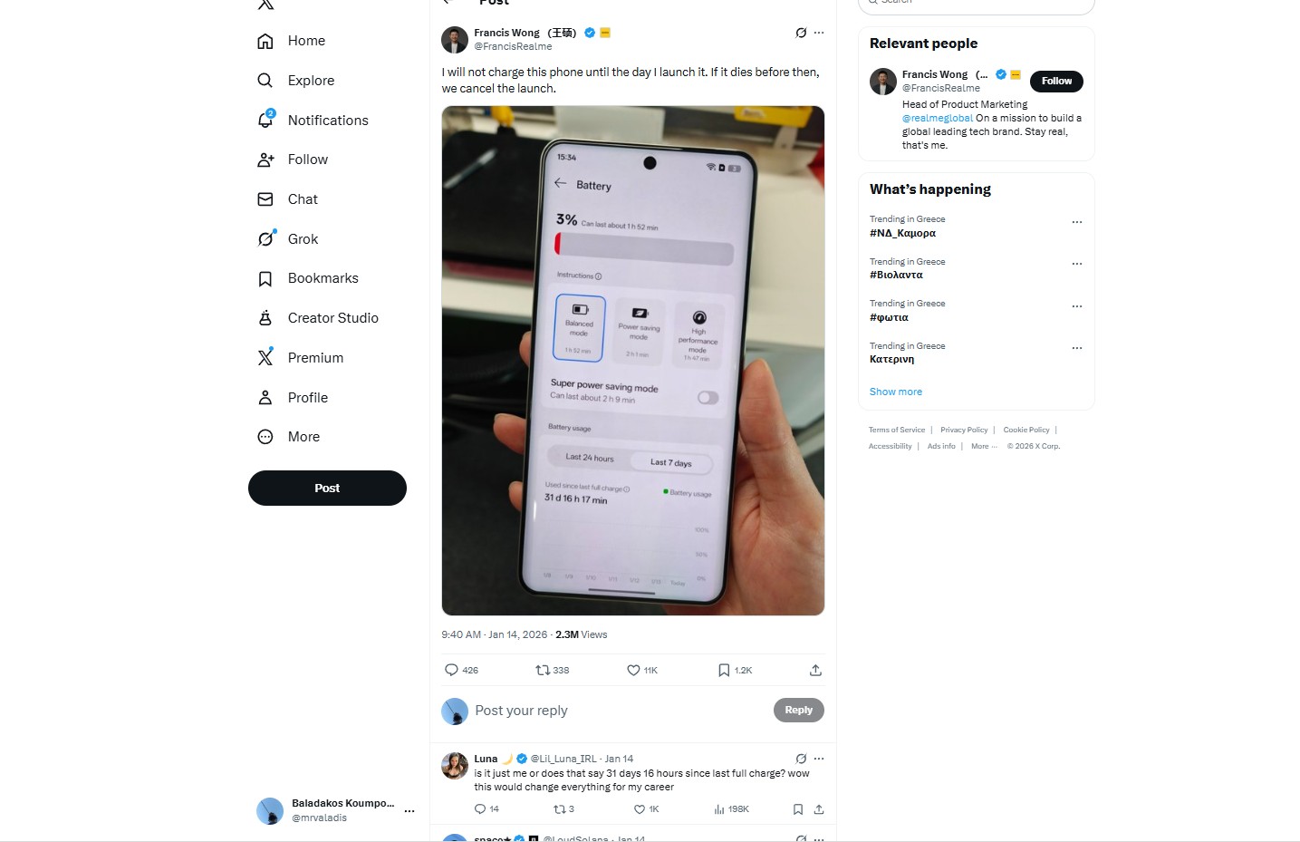 Το άκρως εντυπωσιακό γεγονός αποδεικνύεται από στέλεχος της ίδιας της Realme, ο οποίος δημοσίευσε μία φωτογραφία του P4 Power να βρίσκεται στο 3% μετά από 31 ολόκληρες ημέρες.
